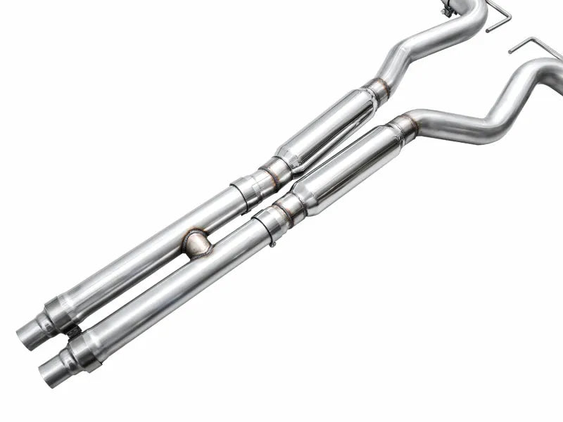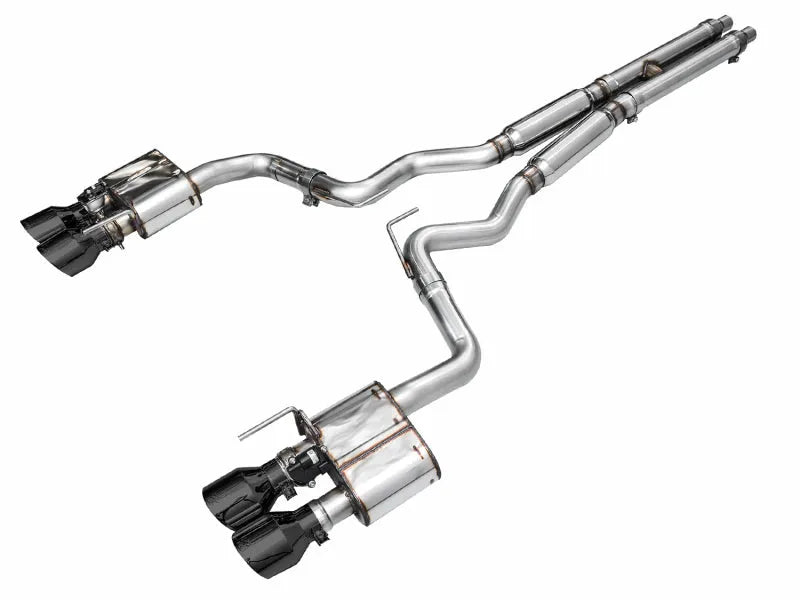 The stampede. Presenting the AWE Catback Exhaust for the Ford S650 Mustang GT. The options: SwitchPath™: two tones, one tailored package with full control. SwitchPath™ retains all of the customization of the factory active exhaust while giving your 5.0L the means to sound the way it should–deep, rich, and uncongested. Track Edition: for those who like their volume like their speed, the Track Edition has minimal filter in the rear via dual straight lengths of 3” stainless steel. It’s light, it’s loud (in & out), it’s cost-effective, and isn’t for the faint of heart–you’ve been warned. Full 3” & modular: each catback option features a full 3” design with modular, slip fit inlet adapters for perfect fitment with the factory headers while facilitating a dual 3” connection for drivers looking to get spicier up stream. Valved for your comfort: SwitchPath™ features tier 1 OEM-supplied valves that retain full factory functionality and behavior. Drive modes, customized settings, and programmable buttons–they’ll obey your commands. Hearty with an H: and so damn deep. Thanks to the precision H-pipe, your 5.0L V8 will produce a deep, rich muscle tone with minimal wrasp (unlike an X-pipe). Comes standard no matter the choice of exhaust. Bullets in the middle: each catback option features straight-through bullet-style resonators in the mid pipes to further defeat wrasp, especially helpful when upgraded headers are introduced into the exhaust stream. Power to the pavement: dyno-verified gains of +12 hp and +10 lb-ft of torque at the wheels on an otherwise stock vehicle. 100% emission-friendly: Touring and Track Editions do not interfere with any factory emissions equipment. Bringing up the rear: quad 4” slash-cut, double-walled tips available in chrome silver or diamond black. Made in PA, USA: engineered, designed, and manufactured in-house at AWE using US-sourced .065”-wall T304L stainless steel.