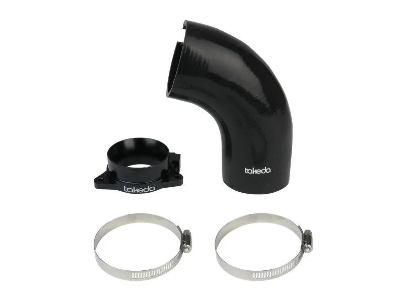 This turbo inlet is the perfect addition to the Takeda intake. It removes the air flow restriction of the factory turbo inlet and guarantees the maximum air flow to the turbo for maximum power. It provides a smooth transition for the air from the Takeda air intake tube to the turbo with the minimum restriction. Precisely CNC machined out of 6061-T6 billet aluminum, the adapter mounts directly onto the turbo and guides the increased air flow from the Takeda intake into the turbo. It is black anodized for durability and a stealthy appearance. This turbo inlet utilizes a flexible silicone coupling that is reinforced with three layers of polyester material, making it resistant to wear and deterioration. The silicone coupling mates directly to the aluminum turbo adapter and the Takeda air intake tube. All necessary clamps are provided. All necessary clamps and hardware are provided for a fast and easy installation. The factory harness bracket mounts directly onto the aluminum adapter for perfect fitment. This item will only fit with Takeda air intake systems P/N: 56-10021D , 56-10021R, 56-70021D and 56-70021R . It will NOT fit with the factory air intake system. For use with factory air intake system, see part number 59-20001.