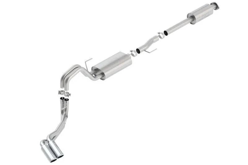 EXCEPT Raptor. Add Adapter 60556 for Crew Cab with Standard Bed (6' 6") 156.8" wheelbase, or Adapter 60564 for Extended Cab with Long Bed (8') 163.7" wheelbase. This BORLA ® 3" into dual 2.25" Cat-Back ™ exhaust system for the Ford F-150 features the classic S-Type sound with no drone inside the vehicle. It exits through 4" bright chrome on T-304 stainless steel tips. A system with black chrome on T-304 stainless steel tips is also available. BORLA ® Cat-Back™ and Axle-Back exhaust systems feature patented straight-through and multi-core technology designed to unleash hidden horsepower. Increased exhaust velocity adds power, driving excitement, fuel economy, and the distinctive BORLA ® Sound of Power respected by motoring enthusiasts everywhere.