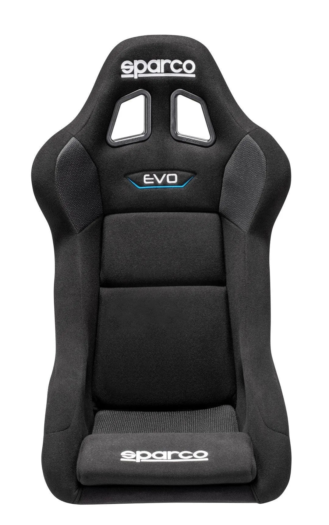 The EVO QRT competition seat has been redesigned with new improved updates. The EVO QRT is now made with all-new QRT Technology which results in an ultra-light shell. The EVO QRT has been updated from the previous EVO seat with a reduced shoulder bolster dimension that allows fitment into smaller cockpits but can still accommodate a medium size driver. Also the shoulder harness belt openings have been raised to accommodate a taller driver. The EVO QRT series of seats feature the most back angle rake of all Sparco seats for a very comfortable driving position.  Available in cloth or vinyl.  The EVO QRT is FIA approved.