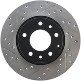 StopTech Drilled and Slotted Sport Rotors are 1-piece direct replacement brake discs for factory brake systems and stock calipers that look great behind your wheels – and offer significantly improved braking performance. The unique cross-drilling and slotting aids with heat and brake dust dispersal, prevents glazing of the pads, adds bite and improves wet and dry braking performance. Built to last, the black e-coating provides protection from corrosion and the high carbon metallurgy (in most applications) offers quieter operation, better crack resistance and increased performance.