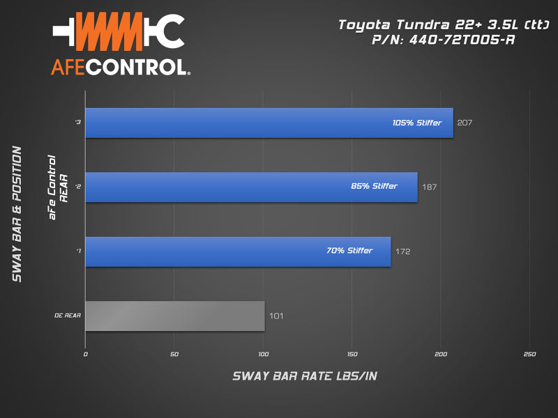 Dramatically reduce body roll without sacrificing ride quality with the aFe CONTROL Tundra rear sway bar. Our 3-way adjustable sway bar will allow you to easily dial in the handling balance of your Tundra. Sharpened steering response will improve initial turn-in making your Tundra feel lighter and more agile. The added stability and control are also welcome when hauling heavy loads in your truck bed or towing.